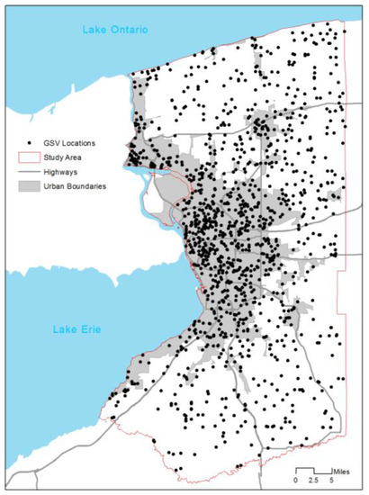Street view services provide street images given a point on the street. We developed our study sample of streets, using the following procedure. First, we selected street segments from the study area, defined as Erie and Niagara Counties, NY, covering urban and rural areas in the Buffalo–Niagara Falls metropolitan region. In the study area, public street network segments were used from the street network dataset built from the 2013 TIGER Census street line files, excluding ones that were non-traversable by pedestrians (e.g., highways or onramps). This step collected all street segments possibly having sidewalks. Second, street segment polylines were split at every vertex and at a 30-ft interval distance. Because most streets have curb cuts or partial sidewalks, we needed to determine the sidewalk presence at multiple locations on a street segment. After initial screening GSV images along continuous streets, the 30-ft interval was chosen to avoid image overlaps between adjacent GSV images. For each split segment, we characterized its geometric properties including the azimuth, calculated by the angle of the split street segment’s orientation. Third, we generated each split segment’s center point where street images will be collected, yielding a total of 1,393,294 (center) points. Finally, from the generated points, we randomly sampled 2000 points as our study sample set. Each point has its latitude and longitude information and the azimuth of the street that the point generated from. Sampled points were used as locations where GSV images were collected via Street View Static application programming interface (API).