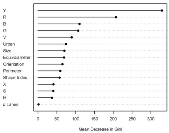 In total, the study area included 79,875 street segments, yielding 1,393,294 center points of split segments. Figure 4 shows locations of GSV image points and the study area. The image points were located mostly within urban boundaries and a small portion in low-density rural areas. From 1219 points, we collected 2438 GSV images in the left or right side of streets. The image pre-processing applied the graph-based segmentation for the all images, yielding a total of 78,255 segmented image regions. Of the regions, 2002 were manually labeled as sidewalks and 76,253 as non-sidewalk regions. Next, we extracted features of the sidewalk image regions and non-sidewalk image regions. Table 1 shows descriptive statistics of the regions. On average, sidewalk regions located in the upper parts in GSV images (Y mean: 617.95 vs. 331.62) have high values in some RGB and HSV histogram distributions, and tend to have regular shapes, small sizes, large perimeters, and small number of lanes, compared to non-sidewalk regions. We established a random forest classifier model using the features. Figure 5 shows the importance of features (variables) of the segment-level random forest classifier model. As expected, the horizontal location, and R, B, G, and V histogram distributions had the top five important features, meaning the location and the color composition are more important than others in detecting sidewalk image regions.