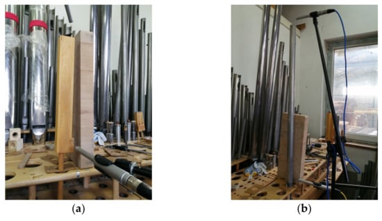 The measurements of the pipes—both geometric dimensions and acoustic measurements—were carried out on the intonation table in the organbuilder’s workshop. We used two measurement microphones Behringer ECM8000 with omnidirectional characteristics, 1.0 mV/Pa sensitivity, and 20 dBA equivalent noise level. The first of them was used for recording the sound at the top of the pipe (distance from the pipe top about 5 cm), and the second one near the pipe lip (distance from the lip about 5 cm). The sampling rate was 48 kHz. The recordings were repeated at least 5 times. The positioning of the microphones is shown in Figure 1. All photographs in this paper were taken by its authors.