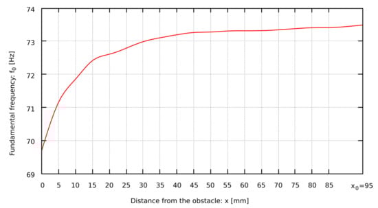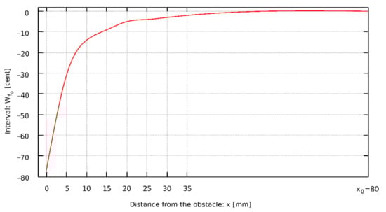 To describe the changes in sound frequency in the situation of the presence of an obstacle, the intervals Wf0 were calculated, which are expressed in cents and are the musical distances between two sounds. Equation (3) was used to calculate each of the intervals, where x is the distance of the obstacle from the pipe lip and x0 is the distance, at which the sound frequency does not depend on the obstacle. Figure 2 shows the relationship between f0 and x.