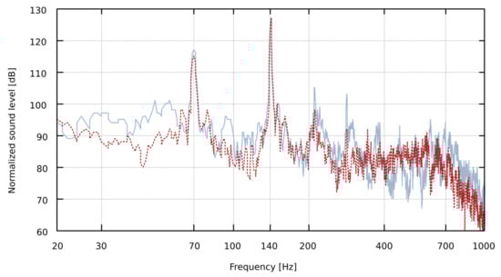 The use of DTFT allowed us to determine the fundamental frequency f0 for each recording with an accuracy of 0.01 Hz, as we calculated DTFT for the frame length equal to the entire sound (about 5 s). The sound level for f0 was also calculated in relation to the sound level generated by the calibrator and the measurement uncertainty σM from Equation (2).