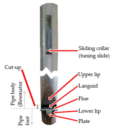To generate a sound in a labial pipe, it is necessary to induce turbulent flow []. In the pipe, this is achieved by using a very narrow flue in the so-called languid and a wedge cutting the air jet in the form of the upper lip. The wedge angle is usually 30° []. The general structure of a flue pipe is shown in Figure 5.
