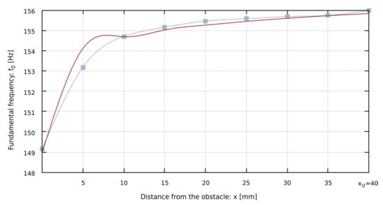 The comparison of the plots representing the dependence of the fundamental frequency f0 on the distance of the obstacle x from the pipe’s mouth for Flute 4ft open D sharp. The grey squares represent the measured data (using DTFT). The grey solid line plot shows the interpolated fundamental frequency for the measured data. The red dotted plot shows data calculated from Equation (25).