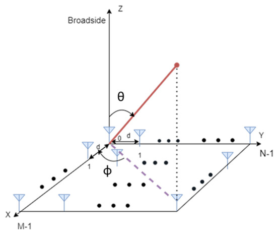 The computation process of ranging observables presented in Section 2.2.1 (in terms of physical-layer abstraction) can also be extrapolated to other observables, e.g., angle observable. The computational complexity of the characterization process also scales with the degrees of freedom. For instance, the calculation of angle observables requires an additional dimension for the antenna array orientation with respect to the transmitter, leading to a four-dimensional (4D) interpolator in terms of angle error, antenna array orientation, SNR and propagation probability. In this work, the angular estimation is based on analytical models. Since NLoS measurements are expected to not improve the localization accuracy, this method focuses only on LoS measurements. The Cramér-Rao Bound (CRB) for AoA is used to assess the positioning capabilities in Additive White Gaussian Noise (AWGN) channel, presenting a feasible estimator. The CRB is a well-known lower bound that describes the maximum achievable accuracy of any unbiased estimator in the moderate- to high-SNR region. According to the 5G specifications, the uplink positioning procedure defined in AoA uses the angle of arrival from multiple-array base stations to compute the user position. A Uniform Planar Array (UPA) antenna with M antenna elements in the x-direction and N antenna elements in the y-direction, depicted in Figure 1, is used to estimate AoA (composed of the azimuth and elevation angles). The distance between adjacent antenna elements is assigned to be , where is the received signal wavelength, c is the speed of light and is the carrier frequency.