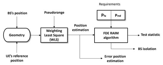 As already stated, positioning accuracy is hindered by many propagation effects such as multipath and NLoS, which may appear due to surrounding obstacles, particularly in urban environments. These circumstances have gradually increased the request for more accurate and reliable positioning solution, thus requiring the implementation of alternative measures to minimize such degradation. Our contribution towards this problem consists of a method [19] for detecting faulty measurements from BS affected by NLoS propagation. The method monitors the residuals resulting from the WLS positioning solution, inspired by the approach implemented by Receiver Autonomous Integrity Monitoring (RAIM) techniques in GNSS receivers. The fundamental concept behind the proposed technique is to check the redundancy of range measurements obtained from all available BSs in order to detect one faulty transmitter at a time [20]. The technique includes both a Fault Detection (FD) [21] and a Fault Detection and Exclusion (FDE) functionality (see Algorithm 1).