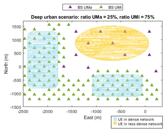 The scenario considered in this work is based on the simulation methodology for outdoor environments within the 5G positioning study in 3GPP Release 16 [7]. It is a predefined Urban Macro-cell (UMa) and Urban Micro-cell (UMi) network scenario based on a deep urban deployment map with BSs deployed above the building rooftops, i.e., BS heights between 20 and 40 m. The deployment consists of a hexagonal grid with seven macro sites, where each has three sectors with an Inter-Site Distance (ISD) around 1732 m in rural areas, 500 m and 200 m in dense urban areas. The method was tested through simulations based on a deep urban deployment map, which comes with an experimental data file of the user’s position. The UEs are randomly placed within the coverage area of the predefined deployment scenario. For reference, see Figure 3. The deep urban area is widely characterized with of the position, while the low density scenario is only shown in of the position. The distance between the BS and UE is used to determine the propagation conditions based on the distance-dependent LoS probability and path-loss models. The multipath channel is stochastically generated following the tabulated channel parameters in 3GPP standard. For each receiver position, the positioning performance is evaluated over 96 iterations of Monte Carlo. The ranging observables are calculated for specific propagation conditions, channel model, system bandwidth (BW), SNR levels and time-delay estimator, and the angle observables are calculated with mathematical models for specific system BW, SNR levels and antenna elements. A 5G PRS and SRS signal with a BW of 20 MHz and 50 MHz at a carrier frequency of 4 GHz, within the cmWave Frequency Range 1 (FR1) of 5G NR and antenna arrays of elements have been considered. The orientation of the BS arrays is set to three typical sectors . The network is supposed to have synchronization error among BSs. Table 1 summarizes the simulation parameters used in this work.