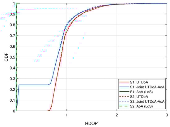 CDF of the HDOP for UTDoA, AoA and hybrid solution. S1 refers to first scenario and S2 refers to the second scenario.