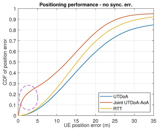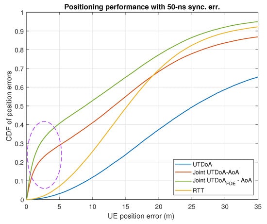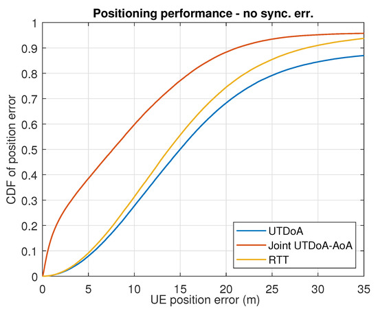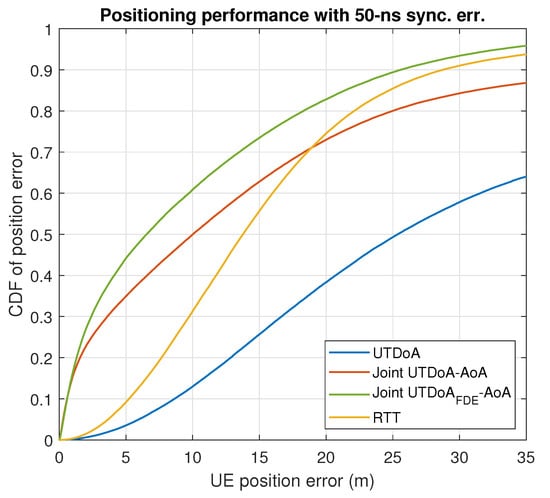 The positioning accuracy is now evaluated by assessing the actual gain that is obtained in terms of the UE positioning performance. In conditions of synchronization error, with the presence of NLoS and multipath, UTDoA leads to a poor accuracy and reliability of the computation position. This is reflected in the simulation results for both scenarios shown in Figure 5 and Figure 6, where severe degradation errors are clearly seen compared to what is expected in ideal conditions (see Figure 7 and Figure 8). The combination of angle observables with those of time delay has already been shown to provide a significant improvement with UTDoA solutions, where the positioning accuracy is less than 30 m for of the UEs. The maximum horizontal position error is reduced by . However, this improvement does not overtake the performance achieved by RTT, which relaxes the constrained positioning problem, i.e., the presence of synchronization error giving a position accuracy improvement of . This can be noticed above the 80th percentile in Figure 5 and Figure 6.