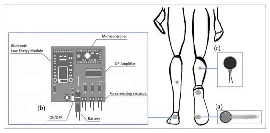 The plantar force acquisition system consisted of two thin-film polymer force sensing-resistors (18.3 mm diameter, 12.7 mm diameter sensing area, thickness 0.46 mm, and force resolution better than 0.5% full scale, FSR Interlink Electronics, Irvine, CA, USA) placed under a regular insole (Figure 1a). The force sensors were placed at the position of the calcaneus and first metatarsal head. The force sensors were used to detect the time at which the heel and forefoot touched and lifted off the ground. The sampling rate of the force sensors was 15 Hz. Bone prominence was used to identify the locations of the force sensors.