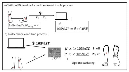 Diagram of smart insole process. Individual’s swing time (x) was collected from the smart insole (a), which would be used as a reference to increase each individual’s swing time by 5% during Biofeedback condition (b).