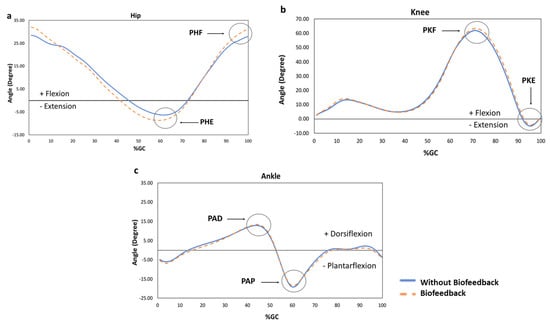 Range of motion of (a) hip, (b) knee, (c) ankle during the gait cycle of the dominant and non-dominant limbs, respectively, during Without Biofeedback and Biofeedback conditions. Positive values represent flexion, negative values extension. PHF, PHE, PKF, PKE = Peak hip and knee flexion and extension, respectively; PAD and PAP = Peak ankle dorsiflexion and plantarflexion. Data represents the average behavior of all participants.