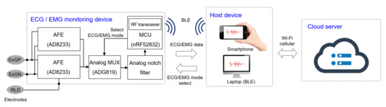 In order to perform ECG analysis and EMG signal-based motor recovery training, traditional Holter monitors and wired EMG monitor devices are applied to patients upon clinical visits. Unfortunately, intermittent ECG abnormalities can go undetected by an on-visit examination [12] and rehabilitation therapy in dedicated facilities for a prolonged period increases the cost and the limited number of therapists results in the delay of treatment, restricting the patient from taking the best advantage of the critical time-limited opportunity [13,14]. Therefore, a wearable home-based monitoring device that is capable of providing immediate medical feedback and relevant ambulatory action is essential. Further, when EMG signals are used for rehabilitation training, the delay in data processing should be minimized while wirelessly transmitting [9,10,11]. Hence, a real-time user-friendly physiological monitoring device and platform that enables remote medical care and patient-driven recovery training is necessary.