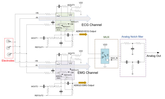 To ensure reliable ECG and EMG capture, the analog front-end (AFE) modifies the analog biopotentials with an instrumentation amplifier configured to amplify the target signals and attenuate common-mode signals. We realized the dual signal capturing system by splitting the electrode node into two AFE channels for both ECG and EMG applications. The input impedance of the AFE is larger than 10 GΩ and the dual-channel configuration introduces a slight gain reduction of less than 10%. A second-order high-pass filter and an amplified second-order low-pass filter conditions the incoming biopotential signal and a right-leg drive circuit drives the common-mode voltage at the electrodes to further enhance the common-mode rejection. We implemented an analog notch filter (twin-T) prior to digital filters, since high order digital filters introduce signal distortion [31] and require a large amount of calculation, which is not suitable for a real-time monitoring system. An analog multiplexer controlled by the microcontroller enables channel selection. The schematic and specifications of the AFE is shown in Figure 2 and Table 1, respectively.