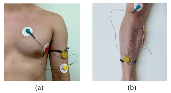 The measurement setup and electrode location. (a) The ECG electrodes were placed in a lead II orientation; (b) EMG electrodes are placed to measure the surface EMG signals from activation signal at the right medial gastrocnemius muscle.