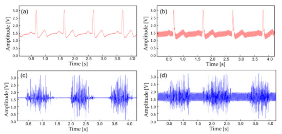 A noise comparison with the captured biopotential signals. (a) ECG acquired outdoors; (b) ECG at 30 cm away from the wall power; (c) EMG acquired outdoors; (d) EMG at 30 cm away from the wall power.
