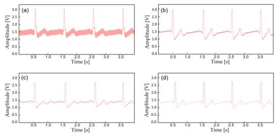 The biopotential signals with additional filtering. (a) Raw ECG acquired from the AFE at 30 cm away from the wall power; (b) ECG filtered with an analog notch filter (twin-T); (c) ECF filtered with an IIR digital filter; (d) ECG filtered with (b,c).