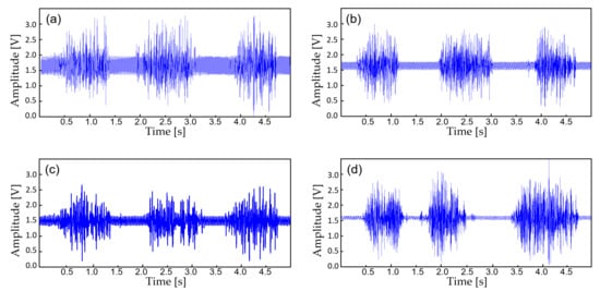The biopotential signals with additional filtering. (a) Raw EMG acquired from the AFE at 30 cm away from the wall power; (b) EMG filtered with an analog notch filter (twin-T); (c) EMF filtered with an IIR digital filter; (d) EMG filtered with (b,c).