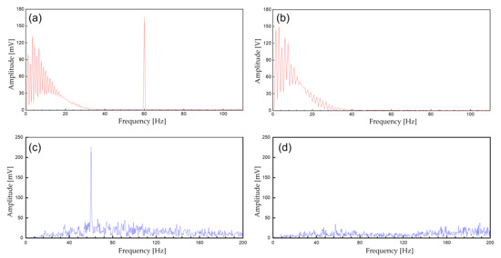 The spectrum of the biopotential signal. (a) Unfiltered ECG signals; (b) filtered ECG signals (analog notch and digital IIR filter); (c) unfiltered EMG; (d) filtered EMG signals (analog notch and digital IIR filter).