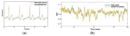 A comparison between this work and RHS2116 Stim/Recording System (Intan). (a) Time domain ECG acquired from this work and reference instrument at lead II orientation. (b) The R-R peak interval (heart rate) acquired for 10 min.