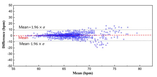 Bland–Altman plot of the heart rate. The overall signal coverage of this work shows an almost perfect overlay compared to the reference instrument within a difference of 0.2 ± 4.65 bpm.