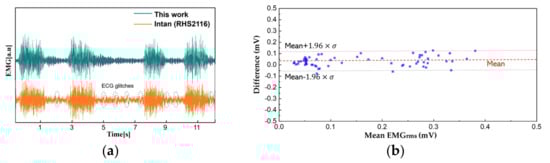 A comparison between this work and reference instrument. (a) Time domain EMG signals acquired from the right medial gastrocnemius muscle; (b) the Bland–Altman plot from EMGRMS.
