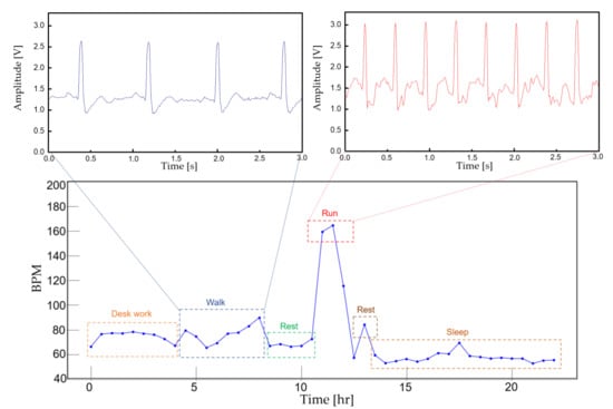 A continuous 30 min averaged BPM for 24 h. The actual ECG signal is displayed for walking and running activity.