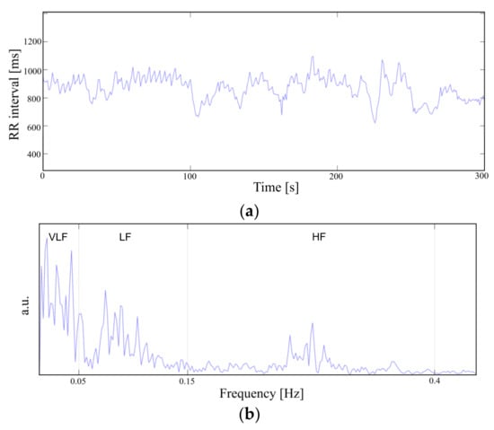 Heart rate variability in (a) time domain and (b) frequency domain.