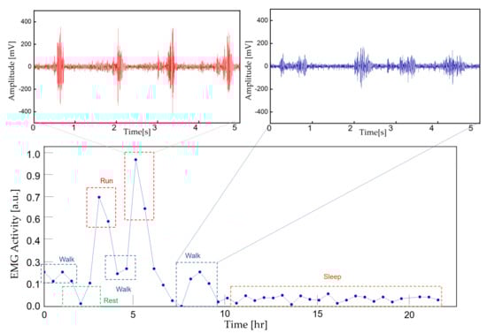 A continuous 30 min averaged EMG intensity for 24 h. The actual EMG signal is displayed for running and walking activity.