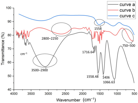 FTIR analysis were performed to study the different steps of the aptasensor fabrication. Figure 2 shows the FTIR spectra of the activated CNTs (curve a), activated CNTs-AuNPs (curve b), and activated CNTs-AuNPs-Aptamer (curve c). As shown in Figure 2, The FTIR spectrum of activated CNTs (curve a) presents a characteristic carboxyl peak at 1716.64 cm−1 which can be attributed to C=O stretching. Therefore, we can conclude that the CNTs have been successfully activated by introducing the carboxylic group. Moreover, the vibration peak at 1558.48 cm−1 confirms the presence of C-C double bond that forms the framework of the carbon nanotube sidewall [32,33]. A strong peak was also observed at 1066.63 cm−1; this is probably associated to the stretching of sulfoxide bond (S-O), usually created in defective CNT areas. As was reported by Chiang’s group, a high H2SO4 concentration may lead to the remaining of sulfoxide groups between two free carbons at the end, defect carbons or two different MWCNTs [34]. On the other hand, the strong (large) band observed between 2900–3500 cm−1 can be attributed to the O-H stretching mode of the carboxyl groups. However, the sharp peak at 1406 cm−1 may be related to the nitro group formed during high-pressure HNO3 treatment under heating conditions [35]. After the electrodeposition of AuNPs, FTIR spectra was also recorded in curve b in Figure 2. As compared to the spectra shown in curve (a), the strong band between 2900–3500 cm−1 related to the O–H group was weakened and shifted (2800–2250 cm−1). This can be related to the attachment of AuNPs to the surface of CNTs [36]. Based on thesmall shoulder observed in the range of 500 to 750 cm−1, the covalent attachment of AuNPs could be confirmed, and thiscan be assigned to stretch the mode of C−S groups [37]. Finally, the last step of the aptasensor fabrication corresponding to the aptamer immobilization onto the MWCNTs-AuNPs composite was also explored by FTIR analysis. The obtained spectra in curve c in Figure 2 shows additional bands at 1558 cm−1, confirming the aptamer binding.