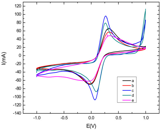 Cyclic voltammetric characterization of electroactive species is a valuable tool for testing the kinetic barrier and electrochemical exchange at the interface [38]. In this work, the different steps of the surface modification have been characterized using cyclic voltammetry where all experiments have been performed in the presence of the redox couples K3[Fe(CN)6]/K4[Fe(CN)6] by scanning the potential between −1 V and 1 V, with a scan rate of 50 mV s−1. Figure 3 represents the electrochemical characterization of the bare and modified glassy carbon electrode by cyclic voltammetry. First, it can be seen from the voltammograms that the oxidation and reduction peaks of the redox couple are visible in the bare electrode, shown in curve a in Figure 3, due to the high exchange rate with the glassy carbon electrode. Then, after the modification of the electrode with CNTs/CS, shown in curve b in Figure 3), a voltametric effect of ferricyanide on the electrode was observed. Thiscan be explained by the active catalytic surface of carbon nanotubes which may increase the active surface of the modified electrode [39]. However, the oxidation and reduction peaks of the redox couple decreased, as compared to that observed with the bare GCE, due to the blocking behavior of CS [40]. After the electrodeposition of AuNPs (Curve c in Figure 3) on the CNTs-CS/GCE surface, we noted that the oxydo/reduction peaks increased and the ΔEp decreased as compared to the CNTs/CS modified electrode. These results confirm the role of AuNPs in increasing the electroactive catalytic surface. We can see clearly that the highest peak was obtained with the AuNPs/CNT-CS composite, because of the large specific surface of the modified electrode and the synergistic effect of AuNPs and CNTs [41,42]. Finally, we can see from curve d in Figure 3, corresponding to the immobilization of the aptamer on the nanocomposite-modified GCE that the oxydo/reduction peaks, as well as the ΔEp, have significantly decreased as compared to the AuNPs/CNTs-CS/GCE. This implies that most of the electrode surface was successfully covered with aptamer [43]. This decrease returns mainly to the negative charge of the phosphate backbone of the DNA aptamer acting as a barrier hindering the electron transfer. After incubating the aptasensing platform with a buffer solution (pH = 4.5) containing 0.1 mM cadmium Cd2+ during 30 mn, CV showed a further peak decrease and an increase in ΔEp, in curve e in Figure 3. This behavior was attributed to the adsorption of Cd2+ on the surface, which considerably hampers the transfer of electrons between the surface of the electrode and the redox couples in solution due to the opening of the rod portion of aptamer and formation of the complex Cd2+-aptamer [44,45].