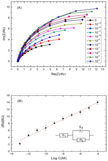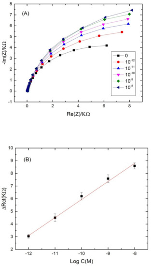 Nyquist plot semi circles were fitted using Randles equivalent circuit model (Figure 4B) where Rs represents the solution resistance, Rct represents the charge-transfer resistance and Q1 represents the constant phase element (an equivalent model of double-layer capacitance). The real part of impedance (Re(Z)) increased as function of cadmium concentration. The results demonstrated that the more Cd2+ was bound on the aptasensing platform, the higher the Rct was. The linear regression equation was normalized to ∆Rct = Rct (aptamer-cadmium) –Rct (aptamer) as a function logarithm of cadmium concentration. Rct (aptamer-cadmium) is the value of the electron transfer resistanceafter Cd2+ binding to the immobilized aptamer on the modified electrode surface. Rct (aptamer) represents the value of the electron transfer resistance after the aptamer immobilization on the modified electrode surface. A steady linear relationship between the Rct and cadmium concentrations was found in the range of concentrations (10−13–10−4 M), with a good correlation coefficient of (R2 = 0.985) and a sensitivity of 1.2 KΩ·M−1 per cadmium concentration decade. The limit of detection (LOD) of the aptasensor was 2.011 × 10−14 M, calculated as the concentration of cadmium corresponding to the three times “s/m” ratio, where “s” is the standard deviation of the blank impedance signal (three replicates) and “m” is the slope of the related calibration curve [46].