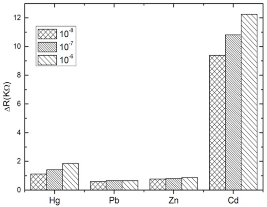 The specificity of the proposed aptasensor was evaluated by comparing the impedance changes after incubation with Cd2+ and other heavy metals, such as Hg2+, Pb2+ and Zn2+, during 30 min. Three concentrations have been tested for each analyte; 10−8, 10−7 and 10−6 M. At this stage, the interactivity of the biosensor and cadmium detection was performed only in PBS buffer. As can be observed in Figure 5, the impedance measurements show clearly that the biosensor was highly selective to cadmium as compared to the other tested heavy metals. No significant signals were recorded in the presence of Pb2+ and Zn2+. However, a slight cross-reactivity was noted with Hg2+ which may be attributed to the special T–Hg–T mismatched base pair between Hg2+ and Cd-aptamer [47,48,49]. These results show that the aptamer immobilized on the electrode surface maintains its affinity and specificity in reaction with the cadmium, producing a significant ∆Rct increase. This may be considered as a validation of the selectivity of the proposed aptasensor, because it allows the discrimination between the tested heavy metals into the entire selected range.