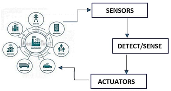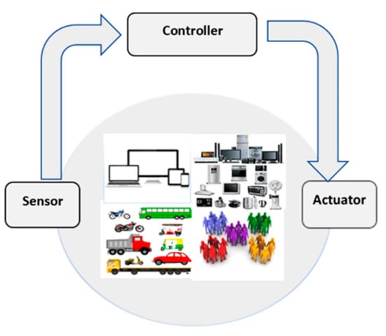 Mobile cloud is a network of networks where physical objects such as mobile devices and sensor-equipped devices are connected to process their running tasks and update real-time data []. The sensors with mobile cloud network (MCN) act as global architecture for advanced level services connectivity, i.e., virtual and physical, information society, and interoperable ICT []. IoT allows communication between different heterogeneous devices by the integration of various technologies, i.e., radio frequency identification (RFID) [], near field communication (NFC) [], wireless sensor networks (WSN) [], and mobile cloud computing (MCC). Thus, we can say it is the technology that allows networked devices to interchange information and perform desired activities without manual assistance. Figure 1 depicts the IoT environment with all the devices to communicate [].
