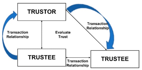 Trust inside the global mobile useability predicts the other mobile device’s behavior. It is a directional relationship between trustor and trustee. The node which desires to communicate with the other party is called the trustor. The other node with which the trustor communicates is called the trustee. Digital trust evaluates past behavior or evidence of the behavior of a device concerning its self-defined level of trustworthiness, which helps perceive its upcoming activities []. It is a presupposition to enhance the decision-making for successful cooperation between two agents. Trust between devices occurs at first glance, and it seems very unusual and extraordinary that devices will be expected to show trustworthiness to one another. However, they neither have an intelligence quotient nor an emotional quotient. Figure 3 depicts the relationship between the trustor and trustee devices [].