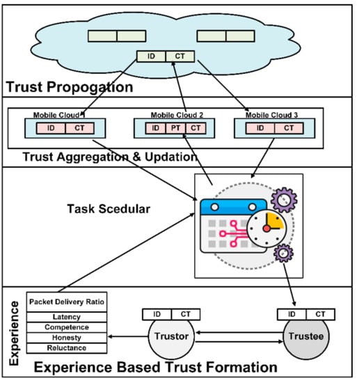 Trust is the ability to predict the behavior of another party. The establishment of trust necessitates two or more communicating parties. Trust can be calculated by a multileveled investigation of relationships in different contexts. Otherwise, it may increase additional complexities while increasing the interaction domain [,]. Research on multilevel trust, i.e., interorganizational trust, has been minimal compared to individual-level research, and badly affects trust interpretation. After the trust’s calculations, only trustable mobile and IoT tasks are ready to upload on the MCC environment.