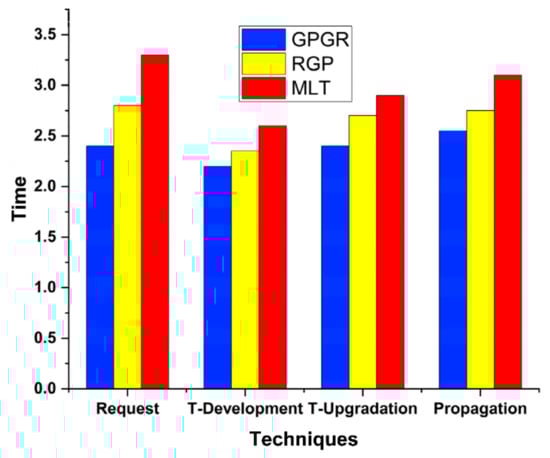 Total is the total time consumed by our model. T is the time taken by the trustee (Te), the trustor (Tr), mobile cloud node (FN), and the cloud server. Figure 10 shows the number of tasks increased to 20,000 to check the validity of the proposed system—the proposed system effectively collects makespan time for effective monitoring and validation of the proposed model. The results also elaborate that our system performs effectively well under such conditions as time passes. In Figure 9, the request elaborates on the request received, and the time it is measured against shows the actual propagated time for request experimentation. T-Development is trust development time. The T-Development time shows the performance of the proposed system, which is better than RGP and MLT techniques. T-Upgradation is trust upgradation. Therefore, trust development time for upgradation of trust enhancement is effective and provides better results than other approaches. Propagation refers to the trust development with upgraded values to show the trust enhancement values for effective analysis and effectiveness. The proposed system shows effective results—overall, 21% better results for GPGR than RGP and MLT approaches.