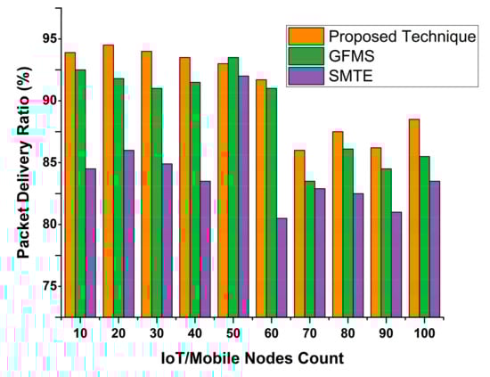 We simulated our proposed technique by deploying 100 mobile or IoT nodes and a central server. Figure 11 shows that our proposed technique achieves high accuracy of value. According to the estimated result ratio, the proposed technique achieves 97% of the packet’s delivery r. Overall packet delivery ratio value is 97.865%, which is more powerful than other techniques.