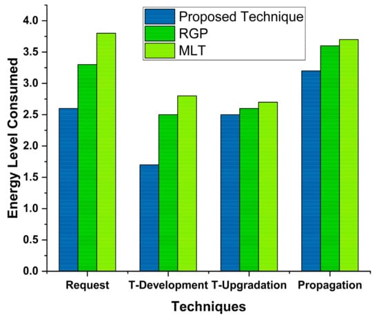 Energy consumption plays an essential role in the success or failure of a model, so it should be measured carefully. Econ is the total energy consumed by a model. E is the energy consumed by request submission (RQ), trust development (TD), trust update (tup), and trust propagation. Again, we are comparing our results with MLT and RGP. Figure 12 shows the MLT and RGP comparison with proposed technique.