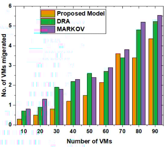 In addition to the time and power consumption, the VM’s availability and migration during task scheduling are the other main contributions. Figure 13 shows the comparison of VMs migration during the task scheduling in the proposed technique compared to DRA and MARKOV analysis. We compared the results on multiple VMs, which shows that during the migration, our proposed technique works better to adjust the VM migration from one platform towards another platform for effective and efficient task scheduling. Time and powers are less consumed in the proposed model whenever scheduling a task needed to migrate from one VM to another. This happens when one VM falls, or any other reason for processing and scheduling tasks.