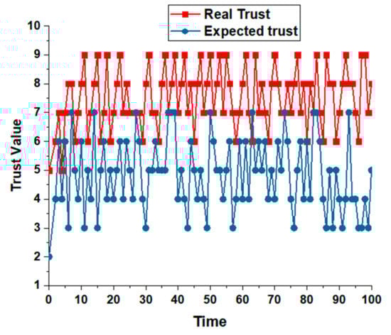 Figure 15 shows the trust comparison among both techniques. With time, the expected trust from the trust comparison and real trust values shows the enhanced trust obtained from the proposed technique. These trust values are evaluated from Equations (1)–(8) and Algorithm 3. The trust is computed, and results show effective trust computation with efficient and effective trust enhancements.