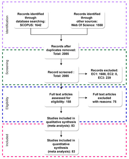 A total of 158 works were selected after screening the inclusion/exclusion criteria on the titles and abstracts. Finally, after a full article assessment, only 83 studies fulfilled all the requirements for this systematic review and, therefore, we included them in our comprehensive analysis.