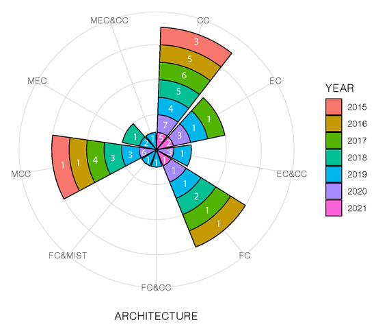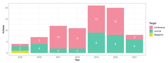 Most of the selected articles were published in conferences with 49 research works, followed by 33 studies in different journals (e.g., IEEE, ACM and SpringerLink) and just one magazine article. In recent years (2019 and 2021), the works published in journals have been significantly increasing, reaching a ratio conference/journal of 1:0.8 in 2020. In 2021, the number of articles has decreased compared to the previous years (last update: November 2021). Overall, there is an upward trend in the last seven years.