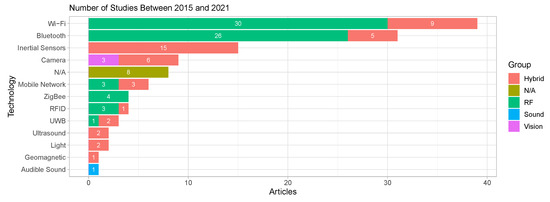 The survey introduced by Kunhoth et al. [24] slightly differs from the previous reviews by including indoor navigation systems and technologies based on computer vision, visible light, and other novel positioning technologies. Hameed and Ahmed [25] based their survey in positioning applications, analysing services such as routing, map data, route selection, accuracy, coverage area, and cost. Ngamakeur et al. [26] offered an analysis of device-free indoor localization and tracking in multi-environments. In this survey, the authors provided a discussion of performance evaluation under the following parameters: accuracy, precision, robustness, scalability, among others. This review also focused their analysis on techniques for localization and tracking, for instance, human detection, identification, and counting. Simões et al. [21] focused their work on positioning technologies for visually impaired people, this work also provides a classification of current technologies and techniques in similar way that [5,6,9,26].