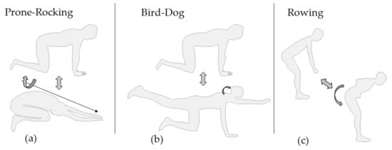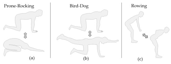 As indicated in Figure 2a, when performing Prone-Rocking, the subject started from a quadruped stand and then moved the upper body backwards until the gluteus touched the heels of the feet, following Voight et al. [33]. Hands, knees and feet remained in position on the ground during exercise performance. Bird-Dog, Figure 2b also started in quadruped stand, but out of the start position the subject then lifted one arm and the diagonally opposed leg. Hand, arm and leg formed a straight line with spine and head following Graham et al. [34]. Figure 2c depicts the exercise Bent-over Rowing. The subject started slightly bent forward with the arms hanging downwards, as if holding an imaginary weight. The imaginary weight was pulled towards the navel until both hands touched the sides of the body. Hand and arm segments of both sides stayed parallel during execution. Standing Bent-over rowing follows the instructions by Fenwick et al. in [35].