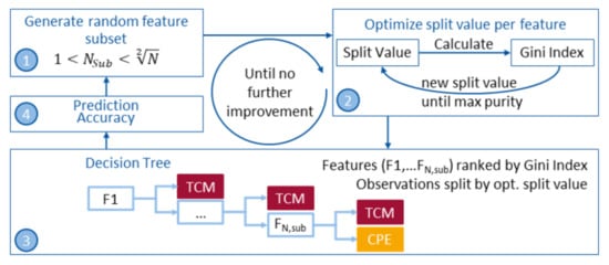 In general, there are three different approaches to selecting features; filter-, embedded- and wrapper-methods. For the presented work, a wrapper method (forward feature selection) was used to find the best performing subset of features. In wrapper methods, the feature selection is wrapped around the classification model and the prediction accuracy of the model is used to iteratively select or eliminate a subset of features [38]. This approach starts with an empty subset of features and sequentially adds features to the subset until there is no further improvement in prediction (see Figure 4). For each feature in a subset, the split value is optimised using Gini’s index [39] to gain the maximum in purity for a node. The corresponding decision tree is then built and the prediction accuracy is obtained using a 5-fold-cross-validation. N, the number of observations used for each training process, is 36 and the maximum number of features per subset NSub < 6.