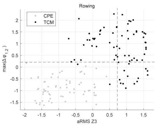 Scatter Plot for Rowing with observations of TCM and CPE. Dashed lines at max(∆φ1,2) = 0.27 and aRMSZ3 = 0.7.