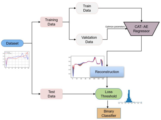 Secondly, the task is converted to a binary classification problem such that the obtained threshold dictates if a data is normal or abnormal by comparing its reconstruction error. Categorically, a particular input data is passed to the model, and afterwards, the reconstructed error is compared to the selected threshold. If the reconstruction error of the input data is higher than the threshold, it is classified as anomalous. For clarification, a graphical representation of the model’s algorithmic flow is presented in Figure 4.