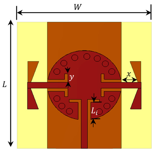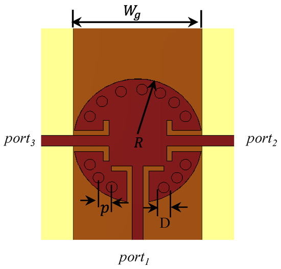 In this section, a design of a compact one-input/two-output ports power splitter is presented to be used as a feeding network for the prospective antenna array. A circular SIC with radius was elected to do this function, as shown in Figure 1, due to its compact size and wide bandwidth. The basic idea of this splitter originally comes from connecting the top and bottom layers by metalized via holes to eliminate unwanted modes, which cause high loss through the utilization of the shorting technique [24]. The metallic via position was carefully optimized to avoid resonance from the dielectric-loaded waveguide modes in the operating bandwidth. Furthermore, the via holes design satisfies the condition of to reduce their losses, where D is the diameter of the via, and is the distance between the two centers of adjacent vias. To avoid the radiation losses of the wall of the metal via holes, the spacing () should be less than half the guided wavelength at the highest frequency of interest [25]. In this design, an angle of 22.5 degrees between each two adjacent metal via holes in the SIC was considered. A genetic algorithm of CST-MWS software was utilized to obtain the optimum parameters of the proposed design. The optimum values of , and are , and , respectively. The optimized width of the ground plane is . Unlike the conventional power splitters that have quarter wavelength arms [26,27], the operating frequency of the cavity is determined by the dimensions of the cavity as demonstrated in Equation (1) [25]:
