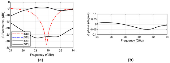 Figure 2a shows the simulated S-parameters of the power splitter. It can be observed that the power splitter achieves an impedance matching with below −10 dB from 27.8 to 31 GHz with a center of resonance at 29.5 GHz. The transmission coefficients and are identical across the entire bandwidth, indicating that the input power can be divided equally between the two outputs. A very low insertion loss of 0.2 dB and a good isolation of more than 25 dB are attained at the center frequency. Furthermore, the phase characteristic variation between the two output ports is less than indicating excellent performance in the scenario of integration with the antenna, as shown in Figure 2b. The GCPW is used as a transition stage between the microstrip line and the SIC. So, the input power could be divided between the two symmetric outputs.