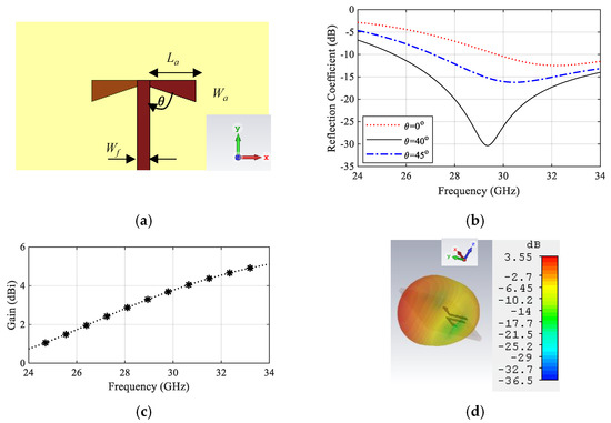 Figure 3 shows the geometry of the suggested DA. The antenna structure was chosen with a semi-triangular shape to control its input impedance easily by changing the angle . The substrate used in this design is Rogers 6035 with a dielectric constant of 3.6, a thickness of and a loss tangent of 0.0013. A 50-Ω microstrip line with a width is used to feed the DA. Figure 3b shows the reflection coefficient for different angles demonstrating that can control the impedance matching efficiently. The initial value of the radiating element length of 2 × is set to the half-guided wavelength corresponding to 29.5 GHz, while the width and angle are calculated based on the quasi-static method presented in [28]. The optimized radiating element length , the width and the angle are , , and 40°, respectively. The final DA covers a bandwidth starting from 26 GHz to more than 34 GHz with resonance at 29.5 GHz, similar to that of the SIC power splitter. The simulated gain of the DA shows a value of about 3.55 dBi at 29.5 GHz, as displayed in Figure 3c. The 3D radiation pattern of the antenna is illustrated at 29.5 GHz in Figure 3d.